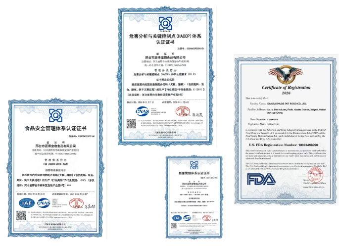 邢台市派得宠物食品有限公司创建于2007年,公司地处全国重要的产粮基地、畜牧业和肉类加工基地,为高品质多层次的产品系列研发和生产奠定了基础。相继通过IS09001质量管理体系认证、IS022000食品安全管理体系认证、HACCP危害分析与关键控制点体系认证及美国FDA食品注册证,为产品进一步出海夯实了基础。